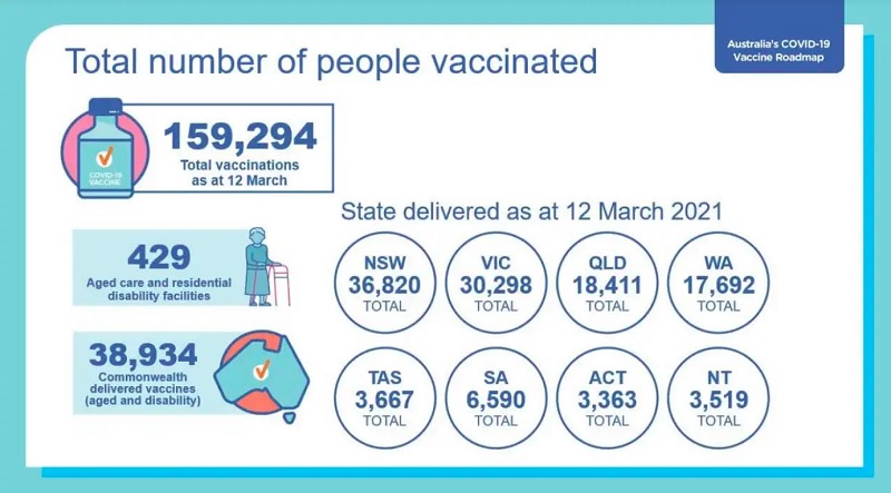 As at 12th March 2021, there had been 159,294 COVID-19 vaccination doses given out in Australia.