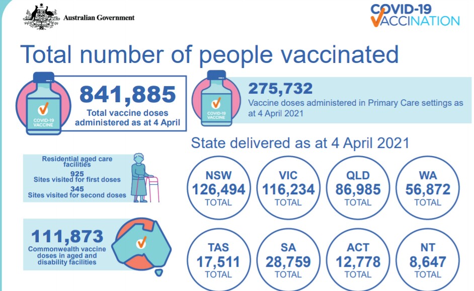 As at 4th April 2021, there have been 841,855 COVID-19 vaccination doses given out in Australia.