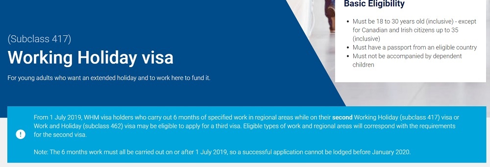 From 1 July 2019, 417 and 462 visa holders who carry out SIX months of specified work in regional areas while on their second Working Holiday (subclass 417) visa or Work and Holiday (subclass 462) visa may be eligible to apply for a third visa.