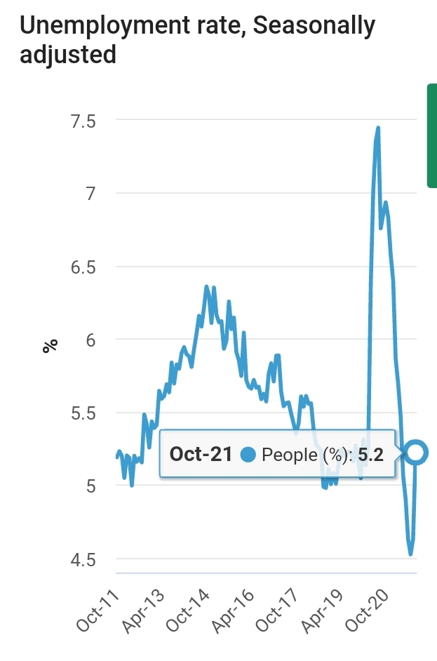 The following graph, showing unemployment rates from 2011, is showing the October 2021 rate (5.2%) as quite reasonable, compared to most previous years.