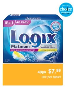 The Logix Platinum Dishwasher Tablets (Lemon Fragrance 40pk) are available at ALDI for $7.99 which is $0.20 per wash.