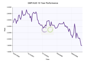 GBP – AUD Exchange Rate The movement between the British Pound and the Australian Dollar for the years between 2000 and 2009 Sponsor ai10 Current rates for the last day, month and year can be found at