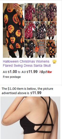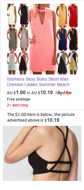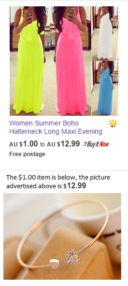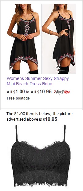 A dress is advertised from $1.00, with a nice picture of a dress, but the actual item for $1 could be a bra top, a cheap ring, or any other item they pick to be able to use the magic low price of $1, just to waste our time and energy looking for the right things.