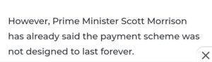 The Prime Minister originally planned for the extra $550 Jobseeker to end in September, but then replaced that with a $250 payment that will end in December. There are no plans to extend after 2020.