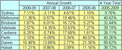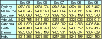 Australian Bureau of Statistics price index for ‘established’ houses in each Capital City, for the quarter to September 2009, showed a national average growth of 4.2% in three months. Individual Cities showed growth of: