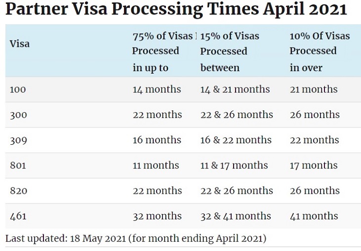 These are the official times quoted by Australian Immigration, for the Partner Visas finalised in the month of April 2021.