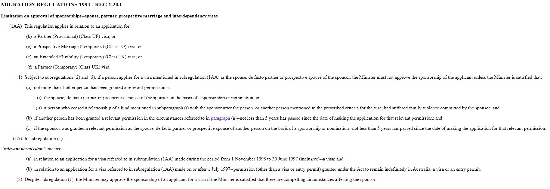 The Migration Regulations 1994 -Reg 1.20J, limits the number of Partners that a person can Sponsor, for a Spouse, Partner, Prospective Marriage and Interdependency visa, during their lifetime.