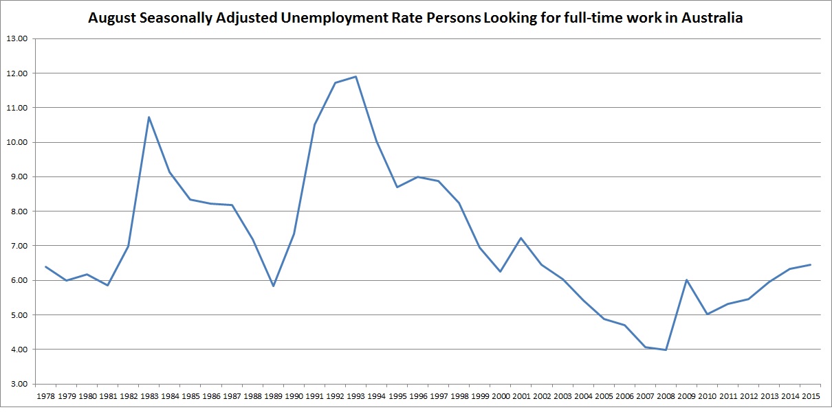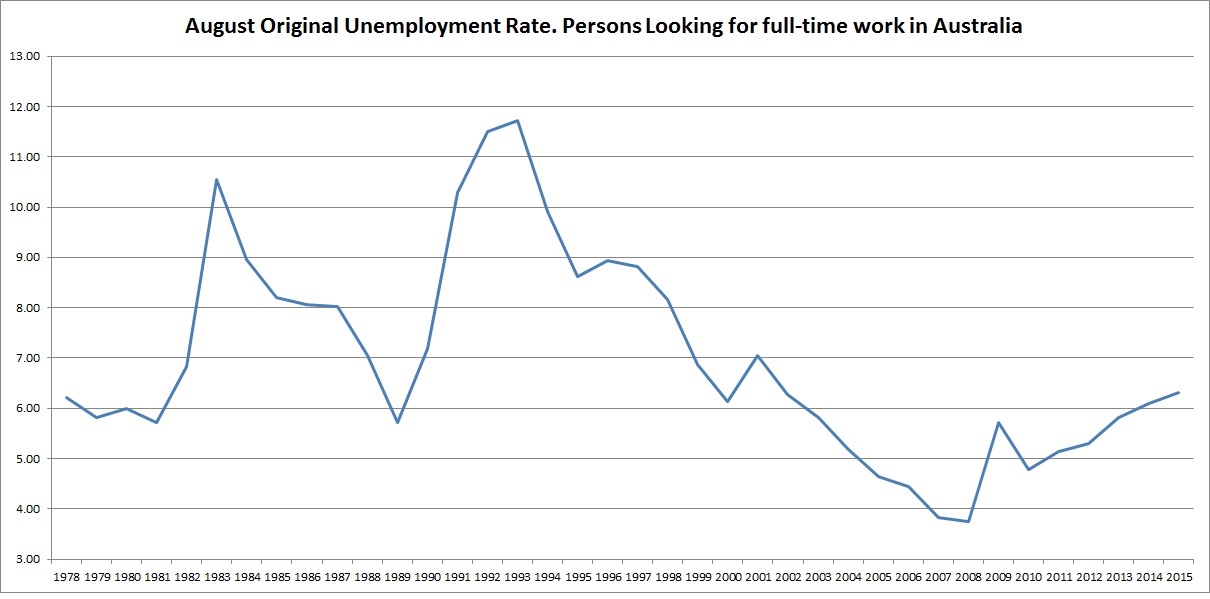 The report also shows the Unemployment Rates for each year from 1978, and the following chart comprises the Unemployment Rate for each August of each of these years, but only for those looking for Full Time Work.