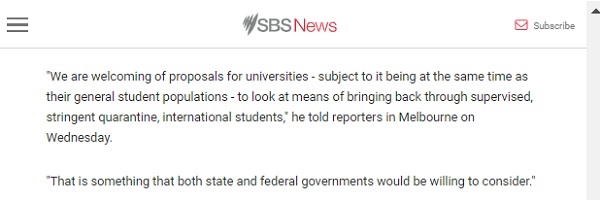 “We are welcoming of proposals for universities – subject to it being at the same time as their general student populations – to look at means of bringing back through supervised, stringent quarantine, international students,” he told reporters in Melbourne on Wednesday.
