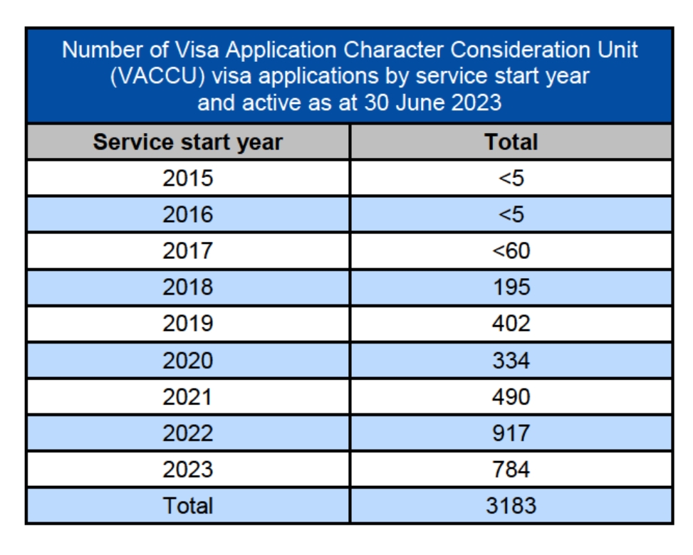 As at 30 June 2023, there were 3,183 applications for Visa Application Character Consideration Unit (VACCU) processing still waiting for finalisation.