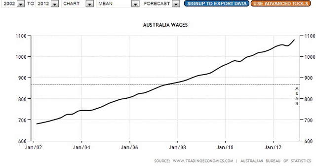 The following chart from Trading Economics shows how Australian wages have risen by 58% over ten years.